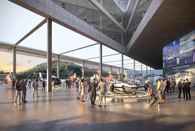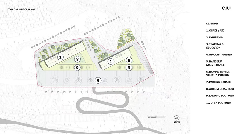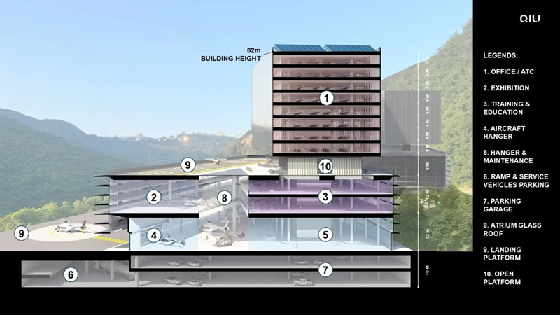 QIU受邀設計的深圳首個載人無人機港,將在未來成為大灣區(qū)低空商務旅行的新總部,兼?zhèn)渚仍行募拔磥黼妱哟怪逼鸾担╡VTOL)測試基地。
