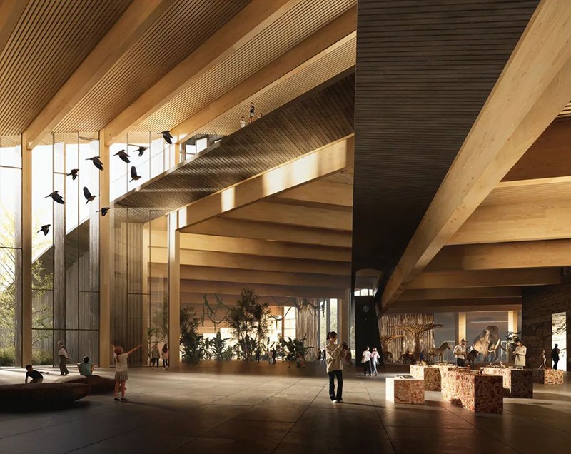 內部空間圍繞中央接待大廳展開,呈放射狀布局,設有五個永久展廳和一個臨時展廳,用于公共活動和特別展覽。上層設有圖書館和餐廳,可俯瞰森林樹冠;下層則設有學習中心,包含研討室、游樂區(qū)和研究實驗室,為學生、家庭和工作人員提供互動空間。