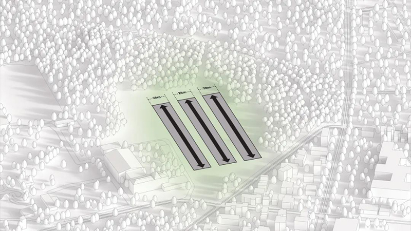 博物館的設計靈感源自三條相互交疊的景觀帶,這些帶狀結構從森林地面升起,形成一個與自然環(huán)境和諧融合的建筑形態(tài)。建筑采用大規(guī)模木結構,并以燒焦的木材作為外立面,使其部分嵌入地下,與周圍公園環(huán)境無縫銜接。傾斜的屋頂提供了廣闊的城市景觀。