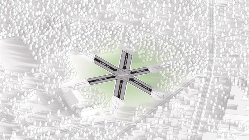 博物館從四面八方均可進入,南側廣場作為主要入口,既是社區(qū)活動的聚集地,也是博物館活動的中心點。蜿蜒的森林小徑和開放的廣場設計,引導游客自然地進入建筑內部,增強了與周圍環(huán)境的連通性。