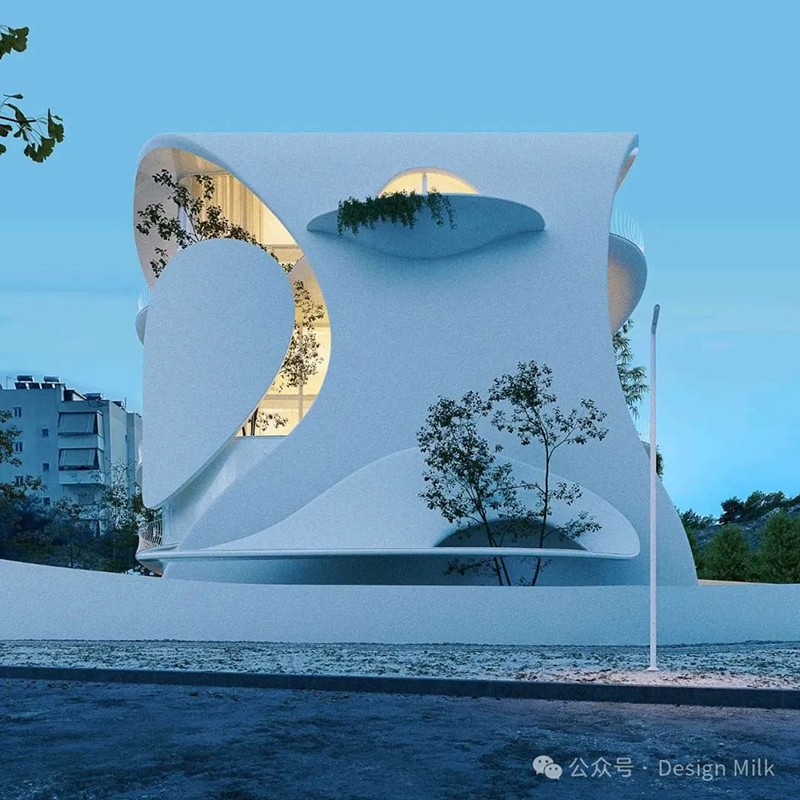 外表面光滑、潔白,加上精心布置的燈光,凸顯了建筑復(fù)雜的輪廓。 設(shè)計中融入了大型圓形開口和彎曲的陽臺,可以看到室內(nèi)景象,并提供與外部無縫融合的室外空間。 這些陽臺上裝飾著綠色植物,不僅增添了一絲自然氣息,也增強(qiáng)了建筑的有機(jī)美感。 整體效果既具有未來感又不失自然,營造出強(qiáng)烈的視覺沖擊。