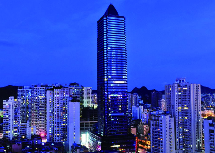 貴陽市凱賓斯基大酒店位于貴陽市護(hù)國路與指月街交接處,建設(shè)用地5740平方米,由塔樓、裙樓、地下室組成。其中塔樓為53層超高層建筑,總建筑面積約7.8萬平方米,設(shè)三層地下室,地下室埋深12.6M,塔樓與裙樓在地下室部分連接,本工程設(shè)有六層裙房、三層地下室,使用功能為設(shè)備用房、車庫、辦公、商場、餐飲娛樂;7層~26層為寫字間,28層~53層為酒店;14層、27層、40層為避難層;層面標(biāo)高自地面以上為212.0M,根據(jù)貴陽地震設(shè)防烈度低、基礎(chǔ)持力層承載力大的特點(diǎn),采用鋼筋混凝土框筒結(jié)構(gòu),其中框架柱通過設(shè)置芯柱有效減小柱截面。